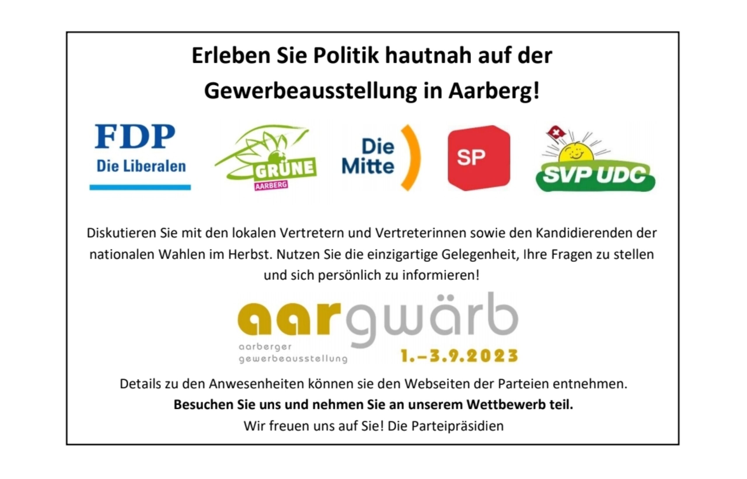 Besuche uns am Gemeinschafts-Stand der Aarberger Ortsparteien an der Aargwärb von 1. bis 3. September!